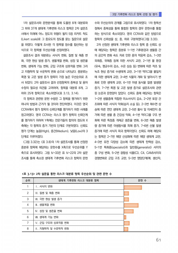 3장 기후변화 리스크 항목 선정 및 평가 61 1차 설문조사와 문헌분석을 통해 도출된 8개 대분류와 그 하위 37개 생태계 기후변화 리스크 항목은 2차 설문조 사에서 미래에 어느 정도의 위협이 될지 5점 리커트 척도 Likert scale 로 그 중요도의 정도를 묻는 질문으로 설문 을 하였다. 이렇게 조사된 각 항목별 점수를 합산하는 방 식으로 각 항목별 우선순위를 선정하였다. 설문조사 결과 대분류는 서식지 변화, 질병 및 해충 변 화, 극한 현상 발생 증가, 생물계절 변화, 성장 및 생존율 변화, 생태계 기능 변화, 군집 구조와 상호작용 변화 그리 고 지형학적 및 수문학적 변화 순으로 나타났다. 중분류는 폭염 및 고온 발생 증가 항목이 가장 높은 우선순위로 조 사 되었다. 2차 설문조사 결과 선정항목의 중...