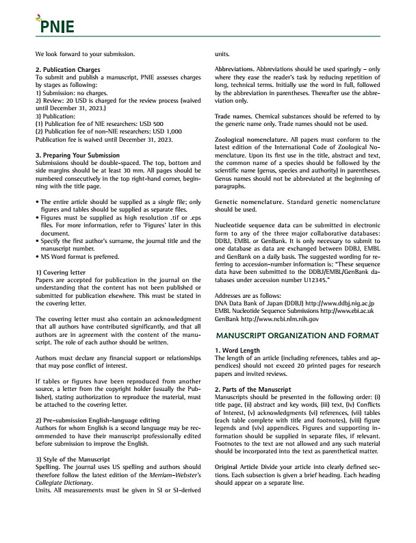 We look forward to your submission. 2. Publication Charges To submit and publish a manuscript, PNIE assesses charges by stages as following1 Submissionno charges. 2 Review20 USD is charged for the review process waived until December 31, 2023. 3 Publication1 Publication fee of NIE researchersUSD 500 2 Publication fee of non-NIE researchersUSD 1,000 Publication fee is waived until December 31, 2023...