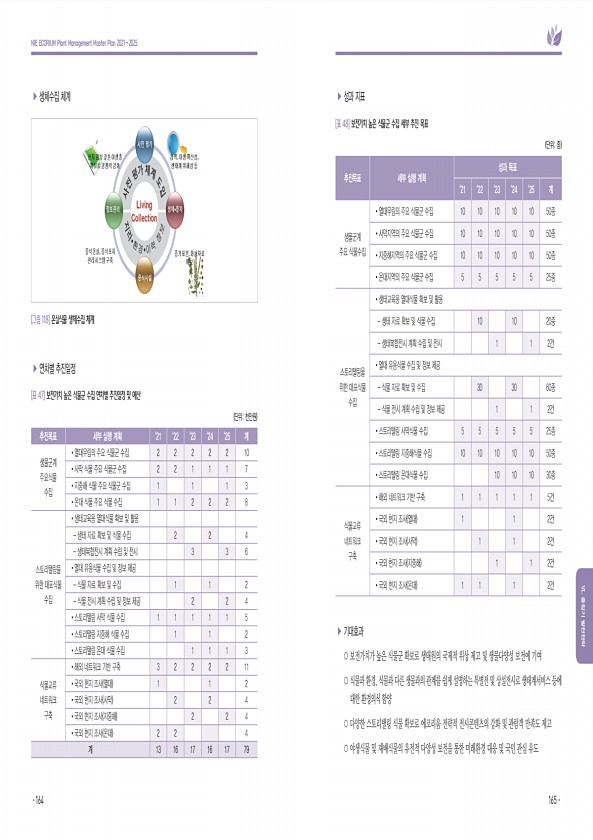 ▶ 성과 지표 [표 48] 보전가치 높은 식물군 수집 세부 추진 목표 단위종 추진목표 세부 실행 계획 성과 목표 ‘21 ‘22 ‘23 ‘24 ‘25 계 생물군계 주요 식물수집 ?열대우림의 주요 식물군 수집 10 10 10 10 10 50종 ?사막지역의 주요 식물군 수집 10 10 10 10 10 50종 ?지중해지역의 주요 식물군 수집 10 10 10 10 10 50종 ?온대지역의 주요 식물군 수집 5 5 5 5 5 25종 스토리탤링을 위한 대표식물 수집 ?생태교육용 열대식물 확보 및 활용 생태 자료 확보 및 식물 수집 10 10 20종 생태복합전시 계획 수립 및 전시 1 1 2건 ?열대 유용식물 수집 및 정보 제공 식물 자료 확보 및 수집 30 30 60종 식물 전시 계획 수립 및 정보 제공 1 1 2건 ?...