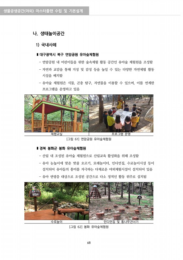 생물공생공간 야외 마스터플랜 수립 및 기본설계 68 나. 생태놀이공간 1 국내사례 ?대구광역시 북구 연암공원 유아숲체험원 연암공원 내 어린이들을 위한 숲속체험 활동 공간인 유아숲 체험원을 조성함 자연과 교감을 통해 지성 및 감성 등을 높일 수 있는 다양한 자연체험 활동 시설을 배치함 유아숲 체험원은 식물, 곤충 탐구, 자연물을 이용할 수 있으며, 이를 연계한 프로그램을 운영하고 있음 체험교실 프로그램 운영 [그림 61] 연암공원 유아숲체험원 ?경북 봉화군 봉화 유아숲체험원 산림 내 조성된 유아숲 체험원으로 산림교육 활성화을 위해 조성함 유아 눈높이에 맞춘 밧줄 오르기, 모래놀이터, 인디언집, 수로놀이시설 등이 설치되어 유아들의 흥미를 자극하는 다채로운 야외체험시설이 설치되어 있음 유아 연령층 대상으로 조성된...