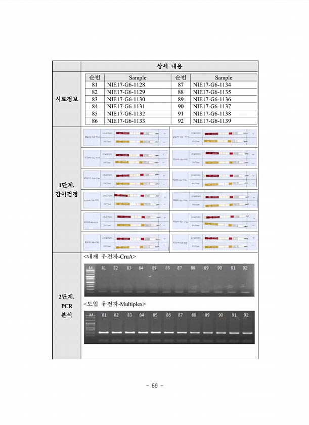 69 상세 내용 시료정보 순번 Sample 순번 Sample 81 NIE17-G6-1128 87 NIE17-G6-1134 82 NIE17-G6-1129 88 NIE17-G6-1135 83 NIE17-G6-1130 89 NIE17-G6-1136 84 NIE17-G6-1131 90 NIE17-G6-1137 85 NIE17-G6-1132 91 NIE17-G6-1138 86 NIE17-G6-1133 92 NIE17-G6-1139 1단계. 간이검정 2단계. PCR 분석 내재 유전자-CruA 도입 유전자-Multiplex