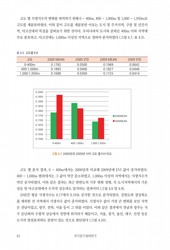 82 국가장기생태연구 고도 별 식생지수의 변화를 파악하기 위해 0 400m, 400 1,000m 및 1,000 1,950m로 고도를 재분류하였다. 이와 같이 고도를 재분류한 이유는 도시 및 주거지역, 구릉 및 산간지 역, 아고산대의 특징을 살펴보기 위한 것이다. 우리나라의 도시와 촌락은 400m 이하 지역에 주로 분포하고, 아고산대는 1,000m 이상인 지역으로 정하여 분석하였다 그림 4.7, 표 4.5 고도 별 분석 결과, 0 400m에서는 2000년과 비교해 2009년에 EVI 값이 증가하였다. 400 1,000m 범위에서는 그 값이 약간 감소하였고, 1,000m 이상의 지역에서는 식생지수가 약간 증가하였다. 이와 같은 결과는 최근 한반도의 기후 변화 경향, 즉 도시지역에서의 기온 상승 및 아고산대에서 ...