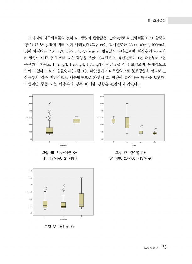 Ⅱ. 조사결과 www.nie.re.kr ? 73 조사지역 사구퇴적물의 전체 K+ 함량의 평균값은 1.36mg/l로 해빈퇴적물의 K+ 함량의 평균값 2.58mg/l 에 비해 낮게 나타났다 그림 66 깊이별로는 20cm, 60cm, 100cm의 것이 차례대로 2.34mg/l, 0.94mg/l, 0.81mg/l로 평균값이 나타났으며, 최상층인 20cm의 K+함량이 다른 층에 비해 높은 경향을 보였다 그림 67 측선별로는 1번 측선부터 3번 측선까지 차례로 1.32mg/l, 1.26mg/l, 1.70mg/l의 평균값을 각각 보였으며, 통계적으로 차이가 있다고 보기 힘들었다 그림 68 해안선에서 내륙방향으로 분포경향을 살펴보면, 상층부의 경우 전반적으로 내륙방향으로 가면서 그 함량이 늘어나는 특징을 보였다. 그렇지만...