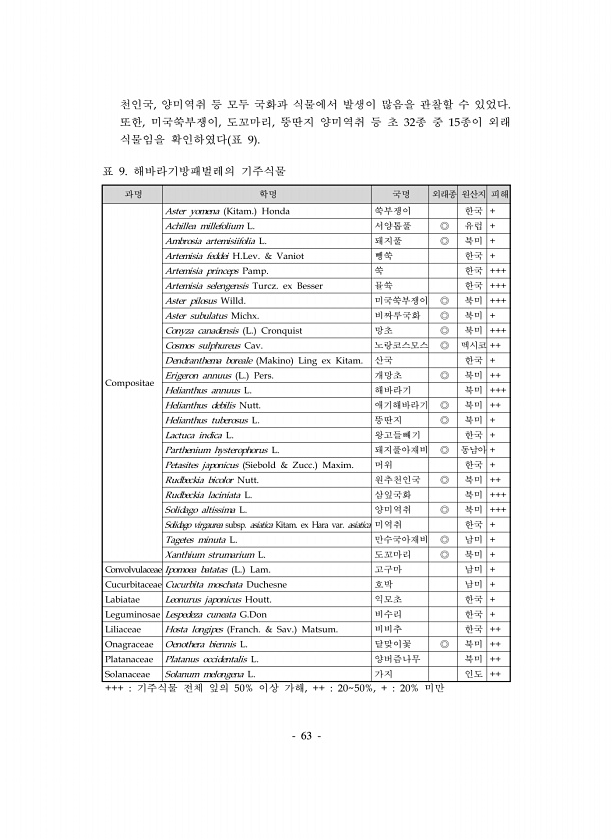 63 과명 학명 국명 외래종 원산지 피해 Compositae Aster yomena Kitam. Honda 쑥부쟁이 한국 + Achillea millefolium L. 서양톱풀 ◎ 유럽 + Ambrosia artemisiifolia L. 돼지풀 ◎ 북미 + Artemisia feddei H.Lev. & Vaniot 뺑쑥 한국 + Artemisia princeps Pamp. 쑥 한국 +++ Artemisia selengensis Turcz. ex Besser 뮬쓕 한국 +++ Aster pilosus Willd. 미국쑥부쟁이 ◎ 북미 +++ Aster subulatus Michx. 비짜루국화 ◎ 북미 + Conyza canadensis L. Cronquist 망초 ◎ 북미 +++ Cosmos sulphureu...