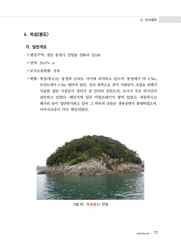Ⅱ. 조사결과 www.nie.re.kr ? 73 4. 쑥섬 봉도 가. 일반개요 ? 행정구역경남 통영시 산양읍 연화리 산228 ? 면적39,074 ㎡ ? 토지소유현황공유 ? 현황쑥섬 봉도 는 통영과 곤리도 사이에 위치하고 있으며, 통영에서 약 0.5㎞, 곤리도에서 0.4㎞ 떨어져 있다. 섬의 북쪽으로 과거 사람들이 조업을 위해서 사용한 접안 시설들이 정비가 잘 안되어 있었으며, 조사시 작은 바지선이 접안하고 있었다. 해안가에 일부 어업쓰레기가 쌓여 있었고, 북동쪽으로 왜가리 등이 집단번식하고 있어 그 하부의 곰솔은 생육상태가 불량하였으며, 미국자리공이 다수 확인되었다. 그림 67. 쑥섬 봉도전경