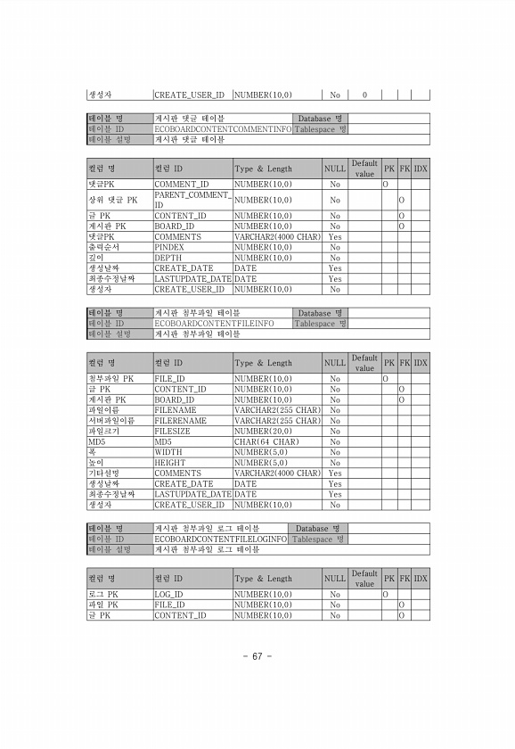 67 생성자 CREATE_USER_ID NUMBER 10,0 No 0 테이블 명 게시판 댓글 테이블 Database 명 테이블 ID ECOBOARDCONTENTCOMMENTINFO Tablespace 명 테이블 설명 게시판 댓글 테이블 컬럼 명 컬럼 ID Type & Length NULL Default value PK FK IDX 댓글PK COMMENT_ID NUMBER 10,0 No O 상위 댓글 PK PARENT_COMMENT_ ID NUMBER 10,0 No O 글 PK CONTENT_ID NUMBER 10,0 No O 게시판 PK BOARD_ID NUMBER 10,0 No O 댓글PK COMMENTS VARCHAR2 4000 CHAR Yes 출력순서 PINDEX NUMBER 10,0 No 깊이 DEP...