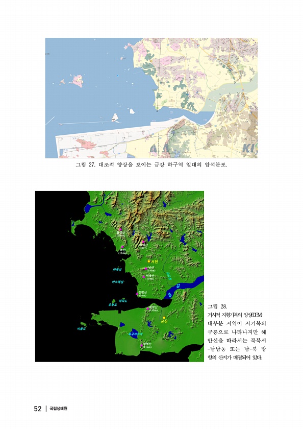 그림 27. 대조적 양상을 보이는 금강 하구역 일대의 암석분포. 그림 28. 거시적지형기복의양상 DEM 대부분 지역이 저기복의 구릉으로 나타나지만 해 안선을 따라서는 북북서 -남남동 또는 남-북 방 향의 산지가 배열되어 있다. 52 |국립생태원