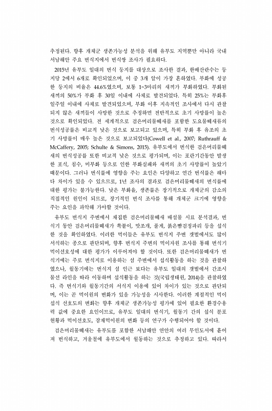 추정된다. 향후 개체군 생존가능성 분석을 위해 유부도 지역뿐만 아니라 국내 서남해안 주요 번식지에서 번식쌍 조사가 필요하다. 2015년 유부도 일대의 번식 둥지를 대상으로 조사한 결과, 한배산란수는 둥 지당 2에서 6개로 확인되었으며, 이 중 3개 알이 가장 흔하였다. 부화에 성공 한 둥지의 비율은 44.6%였으며, 보통 13마리의 새끼가 부화하였다. 부화된 새끼의 50%가 부화 후 30일 이내에 사체로 발견되었다. 특히 25%는 부화후 일주일 이내에 사체로 발견되었으며, 부화 이후 지속적인 조사에서 다시 관찰 되지 않은 새끼들이 사망한 것으로 추정하면 전반적으로 초기 사망률이 높은 것으로 확인되었다. 전 세계적으로 검은머리물떼새를 포함한 도요물떼새류의 번식성공률은 비교적 낮은 것으로 보고되고 있으며, 특히...
