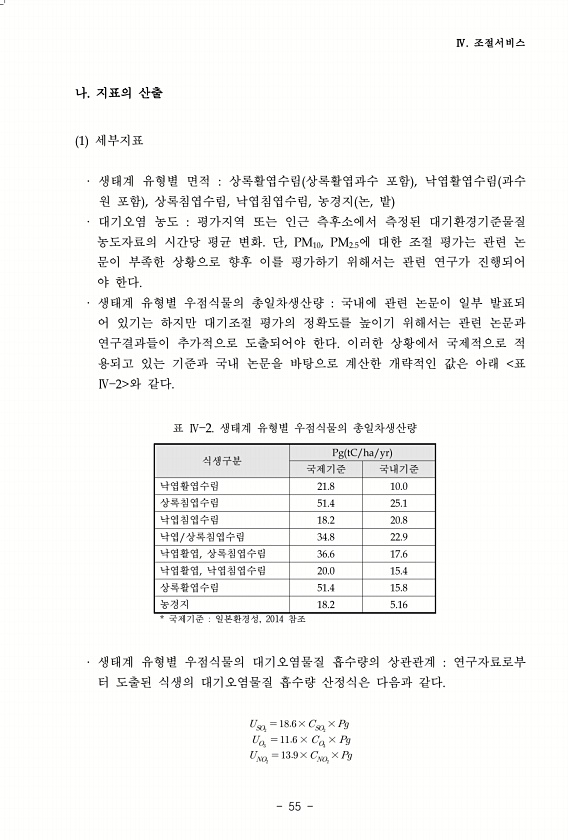 Ⅳ. 조절서비스 55 나. 지표의 산출 1 세부지표 · 생태계 유형별 면적 상록활엽수림 상록활엽과수 포함 , 낙엽활엽수림 과수 원 포함 , 상록침엽수림, 낙엽침엽수림, 농경지 논, 밭 · 대기오염 농도 평가지역 또는 인근 측후소에서 측정된 대기환경기준물질 농도자료의 시간당 평균 변화. 단, PM10, PM2.5에 대한 조절 평가는 관련 논 문이 부족한 상황으로 향후 이를 평가하기 위해서는 관련 연구가 진행되어 야 한다. · 생태계 유형별 우점식물의 총일차생산량 국내에 관련 논문이 일부 발표되 어 있기는 하지만 대기조절 평가의 정확도를 높이기 위해서는 관련 논문과 연구결과들이 추가적으로 도출되어야 한다. 이러한 상황에서 국제적으로 적 용되고 있는 기준과 국내 논문을 바탕으로 계산한 개략적인 값은 아래 표 Ⅳ ...