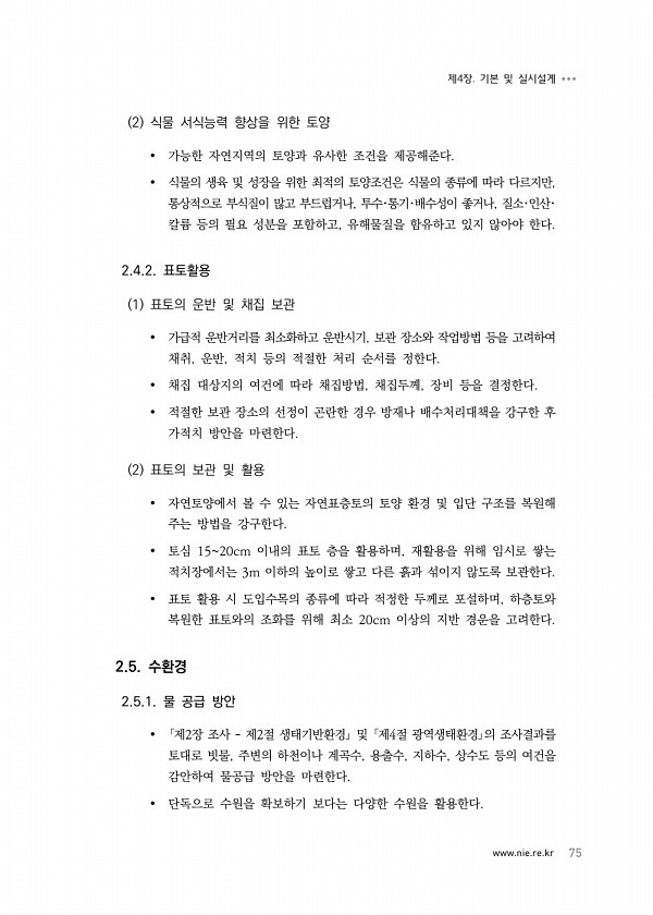 www.nie.re.kr 75 제4장. 기본 및 실시설계 2 식물 서식능력 향상을 위한 토양 가능한 자연지역의 토양과 유사한 조건을 제공해준다. 식물의 생육 및 성장을 위한 최적의 토양조건은 식물의 종류에 따라 다르지만, 통상적으로 부식질이 많고 부드럽거나, 투수?통기?배수성이 좋거나, 질소?인산? 칼륨 등의 필요 성분을 포함하고, 유해물질을 함유하고 있지 않아야 한다. 2.4.2. 표토활용 1 표토의 운반 및 채집 보관 가급적 운반거리를 최소화하고 운반시기, 보관 장소와 작업방법 등을 고려하여 채취, 운반, 적치 등의 적절한 처리 순서를 정한다. 채집 대상지의 여건에 따라 채집방법, 채집두께, 장비 등을 결정한다. 적절한 보관 장소의 선정이 곤란한 경우 방재나 배수처리대책을 강구한 후 가적치 방안을 마련한...