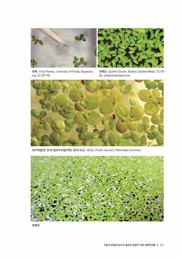 수입과 반입에 심사가 필요한 환경부 지정 위해우려종 Ⅱ 83 개체. Victor Ramey, University of Florida, Bugwood. org_CC-BY-NC 개구리밥 큰 것 과 점개구리밥 작은 것 의 비교. USGS, [Public domain], Wikimedia Commons 개체군. Quentin Groom, Botanic Garden Meise, CC-BYSA, alienplantsbelgium.be개체군