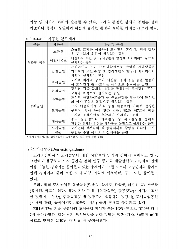 -61- 분류 세분류 기능 및 주제 생활권 공원 소공원 소규모 토지를 이용하여 도시민의 휴식 및 정서 함양 을 도모하기 위하여 설치하는 공원 어린이공원 어린이의 보건 및 정서생활의 향상에 이바지하기 위하여 설치하는 공원 근린공원 근린거주자 또는 근린생활권으로 구성된 지역생활권 거주자의 보건 휴양 및 정서생활의 향상에 이바지하기 위하여 설치하는 공원 주제공원 역사공원 도시의 역사적 장소나 시설물 유적 유물 등을 활용하 여 도시민의 휴식 교육을 목적으로 설치하는 공원 문화공원 도시의 각종 문화적 특징을 활용하여 도시민의 휴식 교육을 목적으로 설치하는 공원 수변공원 도시의 하천가 호숫가 등 수변공간을 활용하여 도시민 의 여가 휴식을 목적으로 설치하는 공원 묘지공원 묘지 이용자에게 휴식 등을 제공하기 위하여 일정한...