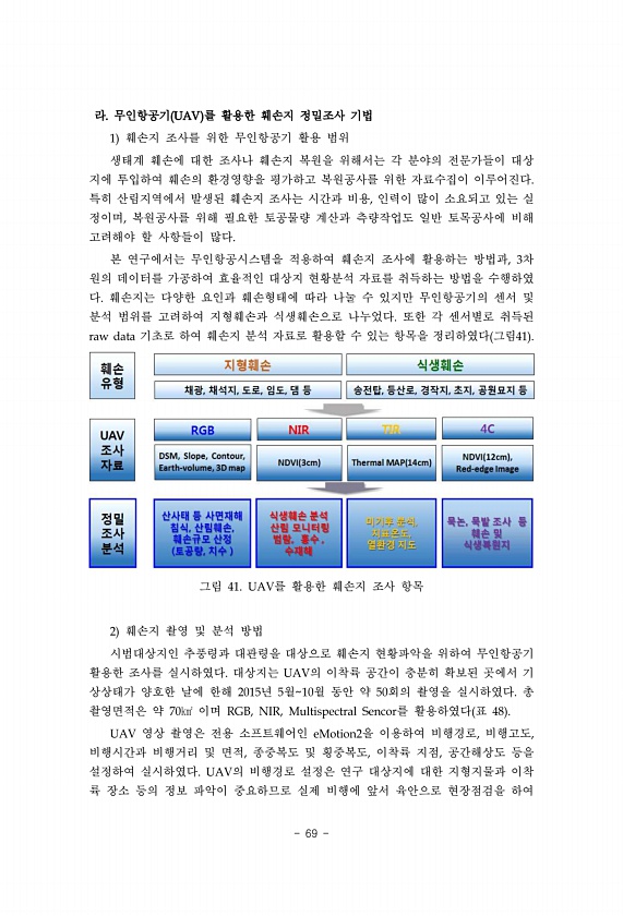69 라. 무인항공기 UAV 를 활용한 훼손지 정밀조사 기법 1 훼손지 조사를 위한 무인항공기 활용 범위 생태계 훼손에 대한 조사나 훼손지 복원을 위해서는 각 분야의 전문가들이 대상 지에 투입하여 훼손의 환경영향을 평가하고 복원공사를 위한 자료수집이 이루어진다. 특히 산림지역에서 발생된 훼손지 조사는 시간과 비용, 인력이 많이 소요되고 있는 실 정이며, 복원공사를 위해 필요한 토공물량 계산과 측량작업도 일반 토목공사에 비해 고려해야 할 사항들이 많다. 본 연구에서는 무인항공시스템을 적용하여 훼손지 조사에 활용하는 방법과, 3차 원의 데이터를 가공하여 효율적인 대상지 현황분석 자료를 취득하는 방법을 수행하였 다. 훼손지는 다양한 요인과 훼손형태에 따라 나눌 수 있지만 무인항공기의 센서 및 분석 범위를 고려하여...