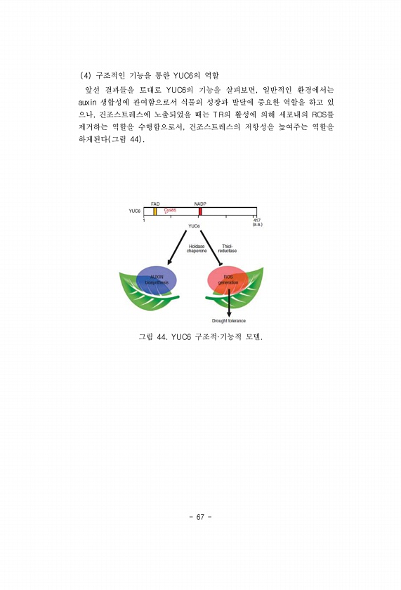 67 4 구조적인 기능을 통한 YUC6의 역할 앞선 결과들을 토대로 YUC6의 기능을 살펴보면, 일반적인 환경에서는 auxin 생합성에 관여함으로서 식물의 성장과 발달에 중요한 역할을 하고 있 으나, 건조스트레스에 노출되었을 때는 T R의 활성에 의해 세포내의 ROS를 제거하는 역할을 수행함으로서, 건조스트레스의 저항성을 높여주는 역할을 하게된다 그림 44 그림 44. YUC6 구조적·기능적모델.
