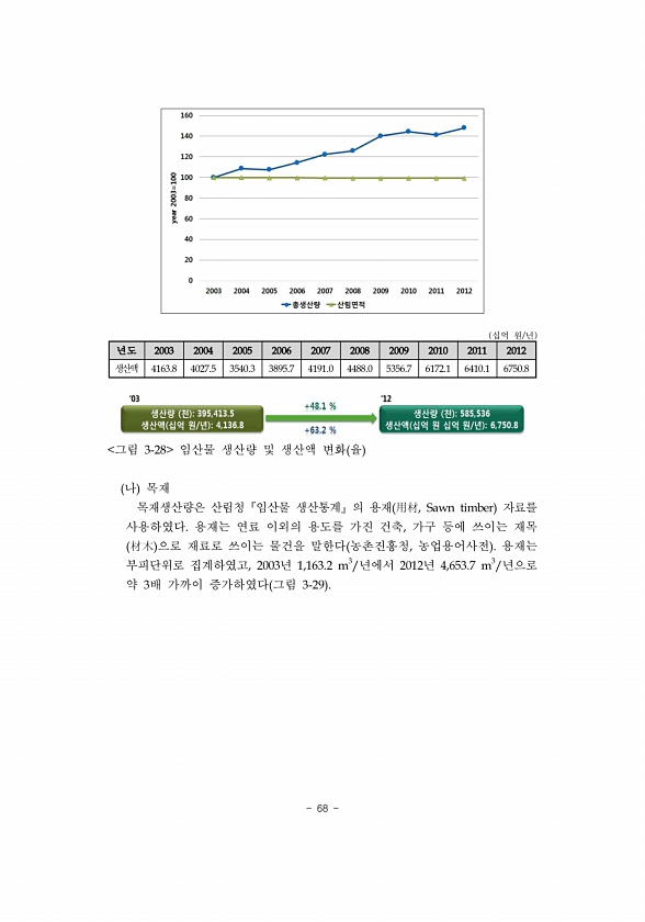 68 십억 원/년 년도 2003 2004 2005 2006 2007 2008 2009 2010 2011 2012 생산액 4163.8 4027.5 3540.3 3895.7 4191.0 4488.0 5356.7 6172.1 6410.1 6750.8 그림 3-28 임산물 생산량 및 생산액 변화 율 나 목재 목재생산량은 산림청『임산물 생산통계』의 용재 用材, Sawn timber 자료를 사용하였다. 용재는 연료 이외의 용도를 가진 건축, 가구 등에 쓰이는 재목 材木 으로 재료로 쓰이는 물건을 말한다 농촌진흥청, 농업용어사전 용재는 부피단위로 집계하였고, 2003년 1,163.2 m3/년에서 2012년 4,653.7 m3/년으로 약 3배 가까이 증가하였다 그림 3-29