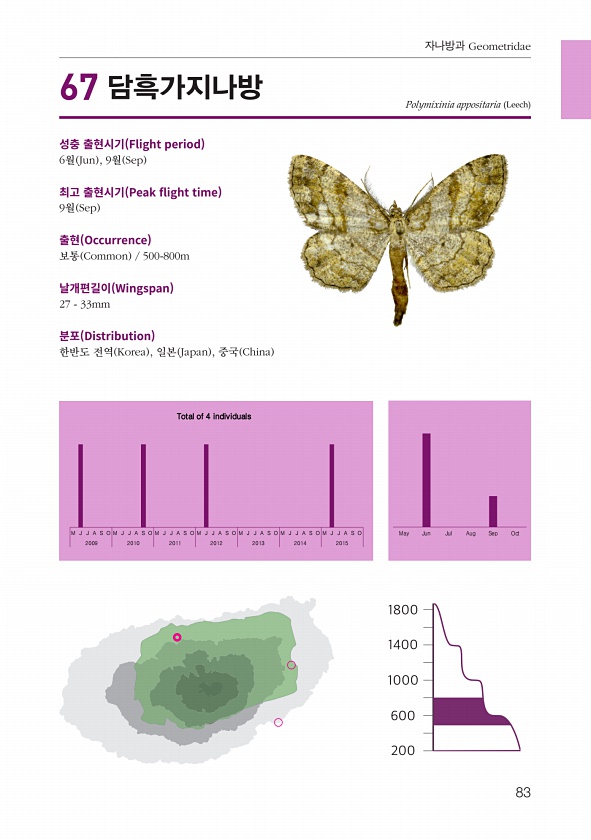 83 자나방과 Geometridae 성충 출현시기 Flight period 6월 Jun , 9월 Sep 최고 출현시기 Peak fight time 9월 Sep 출현 Occurrence 보통 Common 500-800m 날개편길이 Wingspan 27 33mm 분포 Distribution 한반도 전역 Korea , 일본 Japan , 중국 China Polymixinia appositaria Leech M J J A S O M J J A S O M J J A S O M J J A S O M J J A S O M J J A S O M J J A S O May Jun Jul Aug Sep Oct 2009 2010 2011 2012 2013 2014 2015 Total of 4 individuals 67담흑가지나방