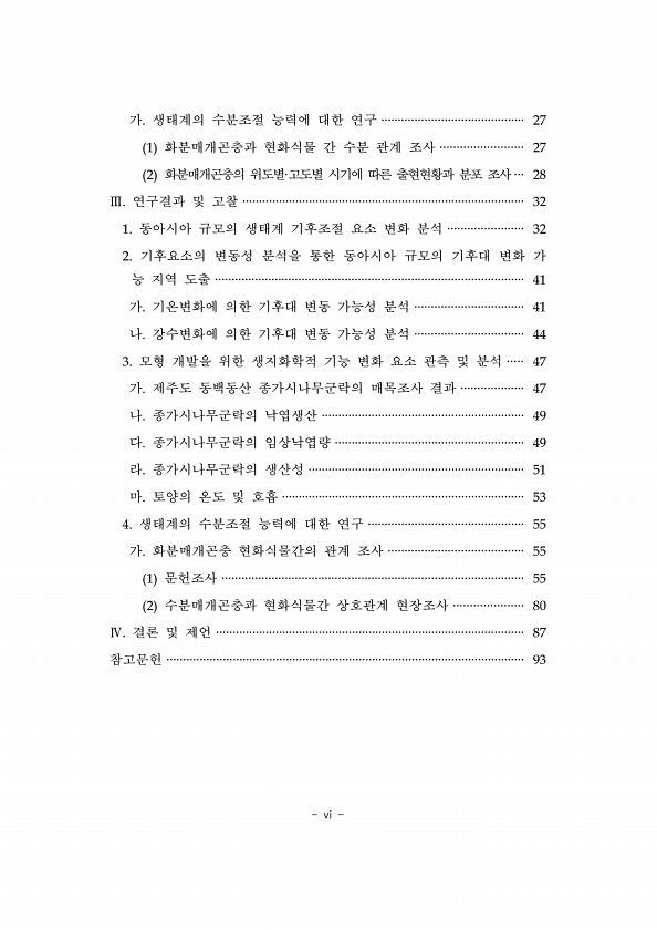 vi 가. 생태계의 수분조절 능력에 대한 연구 ··········································· 27 1 화분매개곤충과 현화식물 간 수분 관계 조사 ························· 27 2 화분매개곤충의 위도별·고도별 시기에 따른 출현현황과 분포 조사··· 28 Ⅲ. 연구결과 및 고찰 ····················································································· 32 1. 동아시아 규모의 생태계 기후조절 요소 변화 분석 ······················· 32 2. 기후요소의 변동성 분석을 통한 동아시아 규모의 기후대 변화 가 능 지역 도출 ························...