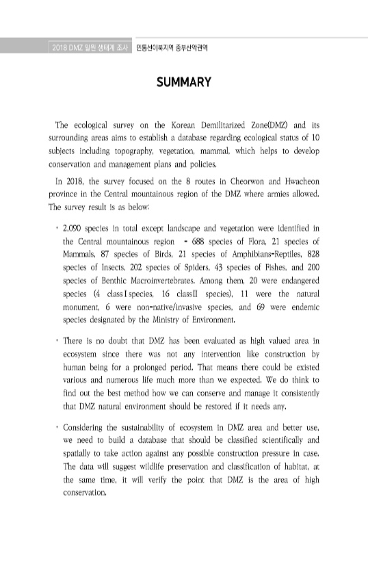 2018 DMZ 일원 생태계 조사 민통선이북지역 중부산악권역 SUMMARY The ecological survey on the Korean Demilitarized Zone DMZ and its surrounding areas aims to establish a database regarding ecological status of 10 subjects including topography, vegetation, mammal, which helps to develop conservation and management plans and policies. In 2018, the survey focused on the 8 routes in Cheorwon and Hwacheon province in the Cen...