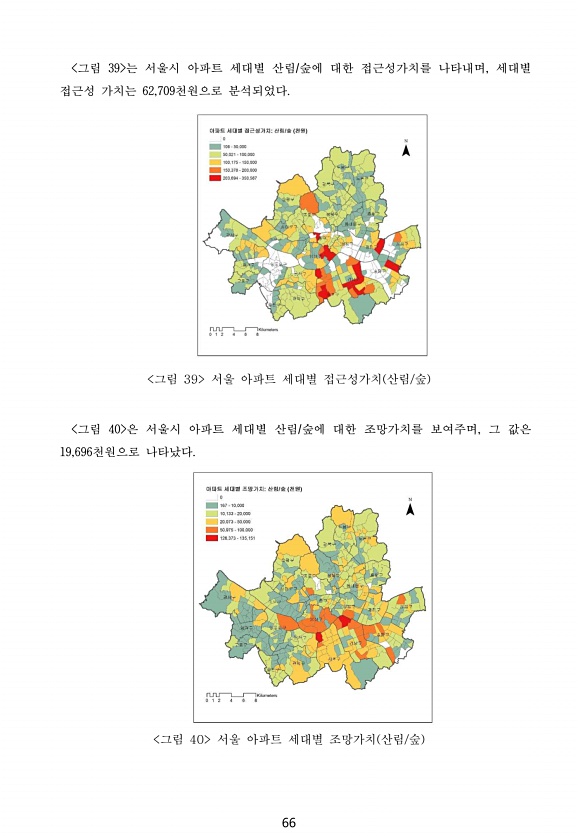 66 그림 39 는 서울시 아파트 세대별 산림/숲에 대한 접근성가치를 나타내며, 세대별 접근성 가치는 62,709천원으로 분석되었다. 그림 39 서울 아파트 세대별 접근성가치 산림/숲 그림 40 은 서울시 아파트 세대별 산림/숲에 대한 조망가치를 보여주며, 그 값은 19,696천원으로 나타났다. 그림 40 서울 아파트 세대별 조망가치 산림/숲