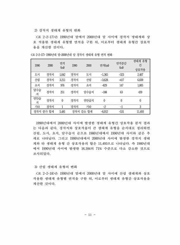 51 2 경작지 생태계 유형의 변화 표 2-2-17 은 1990년대 말에서 2000년대 말 사이에 경작지 생태계와 상 호 작용한 생태계 유형별 면적을 구한 뒤, 이로부터 생태계 유형간 상호작 용을 계산한 것이다. 1990 2000 면적 ㎢ 1990 2000 면적 ㎢ 면적증감 ㎢ 생태계 유형 간 상호작용 도시 경작지 1,042 경작지 도시 -1,365 -323 2,407 산림 경작지 3,211 경작지 산림 -3,628 -417 6,839 초지 경작지 976 경작지 초지 -829 147 1,805 담수습 지 경작지 251 경작지 담수습지 -188 63 439 연안습 지 경작지 0 경작지 연안습지 0 0 0 기타 경작지 1 경작지 기타 -2 -1 3 경작지 증가 합계 5,481 경작지 감소 합계 -6,012 -5...