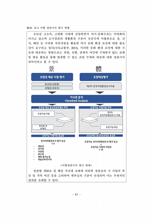 61 오늘날 고소득, 고령화 시대에 진입하면서 여가·문화수요는 다양화되 어가고 있으며 도시경관과 생활환경 수준이 선진국에 미흡하므로 강, 산 지, 해안 등 수려한 자연자원을 활용한 여가 문화 환경 조성에 대한 필요 성이 요구되고 있다 국토교통부, 2011 이러한 문화 환경 조성에 대한 수 요에 대응하는 방법으로는 연령, 성별, 경제적 여건에 구애받지 않는 보행 및 향유 활동을 통해 발생할 수 있는 조망 주체와 대상에 대한 경관가치 파악이라고 볼 수 있다. 지형경관가치 평가 체계 경관법 제30조 및 해당 지자체 조례에 의하면 경관심의 시 사업의 특 성 및 지역 여건 등을 고려하여 세부심의 기준이 선정되며 이는 주관적인 결과를 초래할 수 있다. BOX. Ⅱ-3 지형 경관가치 평가방법