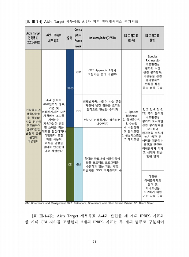 71 Aichi Target 전략목표 2011-2020 Aichi Target 세부목표 출처 Conce ptual Frame work Indicator/Index DPSIR ES 지역지표 항목 ES 지역지표 설명 전략목표 A생물다양성 을 정부와 사회 전반에 주류화하여 생물다양성 손실의 근본 원인에 대응한다. A-4늦어도 2020년까지 정부, 기업 및 이해관계자는 모든 차원에서 조치를 시행하여 지속가능한 생산 및 소비를 위한 계획을 달성하거나 이행한다. 또한 자원 사용이 미치는 영향을 생태적 안전한계 내로 제한한다. IPBES IGID CITE Appendix 1에서 포함되는 종의 비율 R 1. Species Richness 2. 임산물가치 3. 수산업 4. 수원함양 5. 침식조절 6. 온실가스조절 7. 대기...