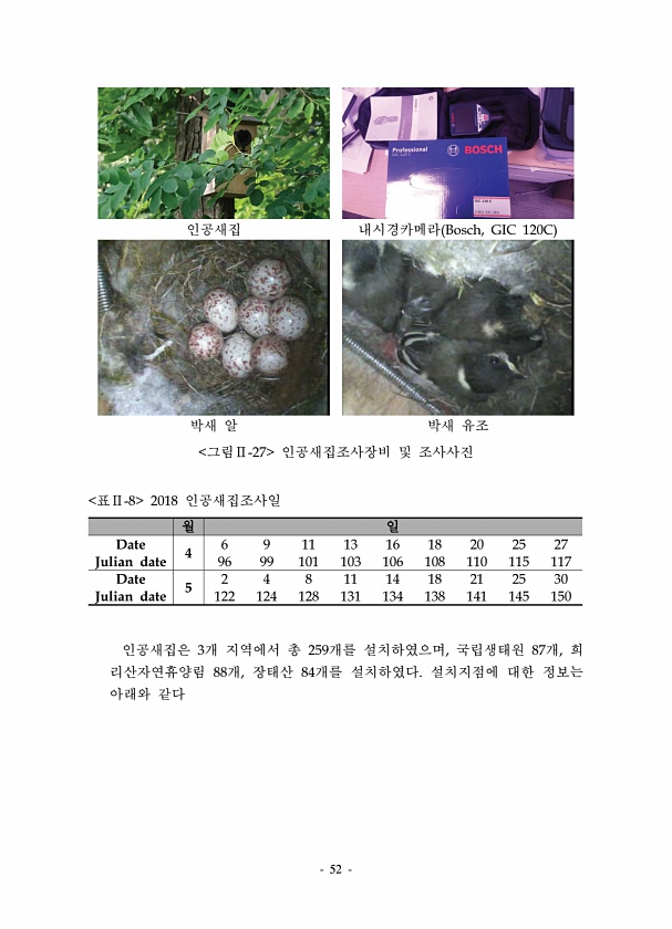 52 인공새집 내시경카메라 Bosch, GIC 120C 박새 알 박새 유조 그림Ⅱ-27 인공새집조사장비 및 조사사진 월 일 Date 4 6 9 11 13 16 18 20 25 27 Julian date 96 99 101 103 106 108 110 115 117 Date 5 2 4 8 11 14 18 21 25 30 Julian date 122 124 128 131 134 138 141 145 150 표Ⅱ-8 2018 인공새집조사일 인공새집은 3개 지역에서 총 259개를 설치하였으며, 국립생태원 87개, 희 리산자연휴양림 88개, 장태산 84개를 설치하였다. 설치지점에 대한 정보는 아래와같다