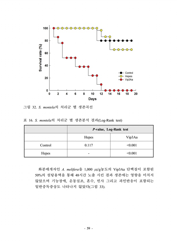 59 그림 32. S. montela의 처리군 별 생존곡선 표 16. S. montela의 처리군 별 생존분석 결과 Log-Rank test P-value, Log-Rank test Hepes Vip3Aa Control 0.117 0.001 Hepes 0.001 화분매개자인 A. melifera을 1,000 ㎍/g농도의 Vip3Aa 단백질이 포함된 50%의 설탕용액을 통해 48시간 노출 시킨 결과 생존에는 영향을 미치지 않았으며 기능장애, 운동실조, 혼수, 빈사 그리고 과민반응이 포함되는 일반중독증상도 나타나지 않았다 그림 33