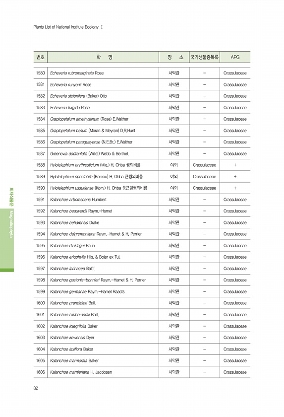 82 번호 학 명 장 소 국가생물종목록 APG 피자식물문 Magnoliophyta Plants List of National Institute Ecology Ⅰ 1580 Echeveria rubromarginata Rose 사막관 Crassulaceae 1581 Echeveria runyonii Rose 사막관 Crassulaceae 1582 Echeveria stolonifera Baker Otto 사막관 Crassulaceae 1583 Echeveria turgida Rose 사막관 Crassulaceae 1584 Graptopetalum amethystinum Rose E.Walther 사막관 Crassulaceae 1585 Graptopetalum bellum Moran & Meyran D.R.Hun...