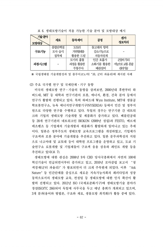 62 표 6. 생태모방기술이 적용 가능한 기술 분야 및 모방대상 예시 기술분야 모방대상 재료 동작?제어 공정 센서? 정보처리 구조?기능 홍합단백질 모사 습식 접착제 도토리 거위벌레를 활용한 드릴 돌고래의 항력 감소기능으로 자동차설계 과정?시스템 모기의 흡혈 과정을 활용한 무통주사 인간 호흡기? 소화기를 활용한 배관설비 곤충의무리 지능으로교통혼잡 관리기술 ※ 국립생태원 기술개발성과 및 블루이코노미 ‘10, 군터 파울리 에 제시된 사례 2 주요 국가별 연구 및 국제단체·기구 동향 미국의 생태모방 연구·기술의 동향을 살펴보면, 2000년대 후반부터 하 버드대, MIT 등 대학과 연구기관의 로봇, 에너지, 환경, 건축 분야 등에서 연구가 활발히 진행되고 있다. 특히 하버드대 Wyss Institute, MIT대 생...