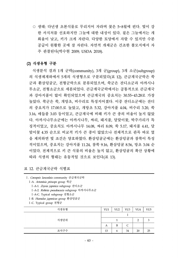 63 ○ 생태다년생 초본식물로 무리지어 자라며 꽃은 58월에 핀다. 빛이 강 한 서식처를 선호하지만 그늘에 대한 내성이 있다. 짙은 그늘에서는 개 화율이 낮고, 키가 크게 자란다. 다양한 토양에서 자랄 수 있지만 수분 공급이 원활한 곳에 잘 자란다. 자연적 개체군은 건조한 불모지에서 자 주 관찰된다 박수현 2009; USDA 2018 2 식생유형 구분 식생분석 결과 1개 군락 community , 3개 군 group , 3개 소군 subgroup 의 식생체계하에서 5개의 식생형으로 구분되었다 표 12 큰금계국군락은 쑥 군과 환삼덩굴군, 전형군락으로 분류되었으며, 쑥군은 잔디소군과 아까시나 무소군, 전형소군으로 세분되었다. 큰금계국군락에서는 공통적으로 큰금계국 과 강아지풀이 많이 확인되었으며 큰금계국의 중요치...