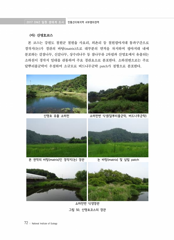 2017 DMZ 일원 생태계 조사 민통선이북지역 서부평야권역 72 ? National Institute of Ecology 마 산명호코스 본 코스는 강원도 철원군 철원읍 사요리, 외촌리 등 철원평야지대 통과구간으로 경작지 논 가 경관의 바탕 matrix 으로 대부분의 면적을 차지하며 평야지대 내에 분포하는 갈참나무, 신갈나무, 상수리나무 등 참나무류 2차림과 산명호에서 유출되는 소하천이 경작지 일대를 관통하며 주요 경관요소로 분포한다. 소하천변으로는 주로 달뿌리풀군락이 우점하며 소규모로 버드나무군락 patch가 점형으로 분포한다. 산명호 유출 소하천 소하천변 식생 달뿌리풀군락, 버드나무군락 본 권역의 바탕 matrix 인 경작지 논 경관 논 바탕 matrix 및 삼림 patch 소하천변 식생경관 그림 50....