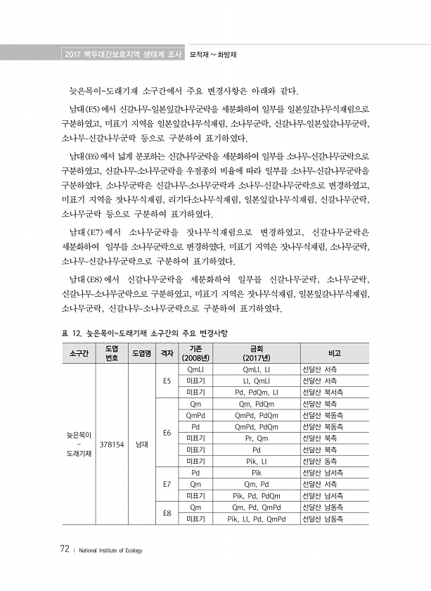 2017 백두대간보호지역 생태계 조사 묘적재 화방재 72 ? National Institute of Ecology 소구간 도엽 번호 도엽명 격자 2008년 기존 2017년 금회 비고 늦은목이 도래기재 378154 남대 E5 QmLl QmLl, Ll 선달산 서측 미표기 Ll, QmLl 선달산 서측 미표기 Pd, PdQm, Ll 선달산 북서측 E6 Qm Qm, PdQm 선달산 북측 QmPd QmPd, PdQm 선달산 북동측 Pd QmPd, PdQm 선달산 북동측 미표기 Pr, Qm 선달산 북측 미표기 Pd 선달산 북측 미표기 Pik, Ll 선달산 동측 E7 Pd Pik 선달산 남서측 Qm Qm, Pd 선달산 서측 미표기 Pik, Pd, PdQm 선달산 남서측 E8 Qm Qm, Pd, QmPd 선달산 남동측 미표...
