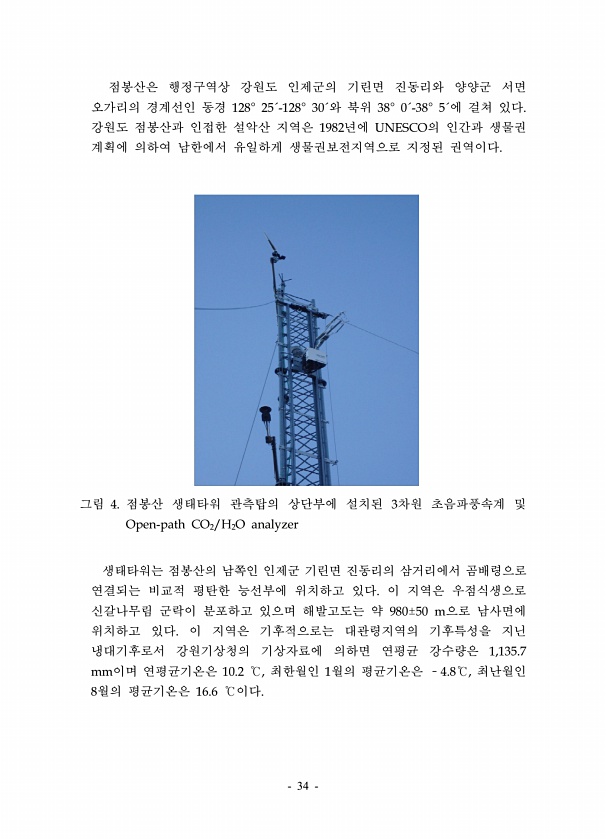 34 점봉산은 행정구역상 강원도 인제군의 기린면 진동리와 양양군 서면 오가리의 경계선인 동경 128° 25´-128° 30´와 북위 38° 0´-38° 5´에 걸쳐 있다. 강원도 점봉산과 인접한 설악산 지역은 1982년에 UNESCO의 인간과 생물권 계획에 의하여 남한에서 유일하게 생물권보전지역으로 지정된 권역이다. 그림 4. 점봉산 생태타워 관측탑의 상단부에 설치된 3차원 초음파풍속계 및 Open-path CO2/H2O analyzer 생태타워는 점봉산의 남쪽인 인제군 기린면 진동리의 삼거리에서 곰배령으로 연결되는 비교적 평탄한 능선부에 위치하고 있다. 이 지역은 우점식생으로 신갈나무림 군락이 분포하고 있으며 해발고도는 약 980±50 m으로 남사면에 위치하고 있다. 이 지역은 기후적으로는 대관령지역의 기...