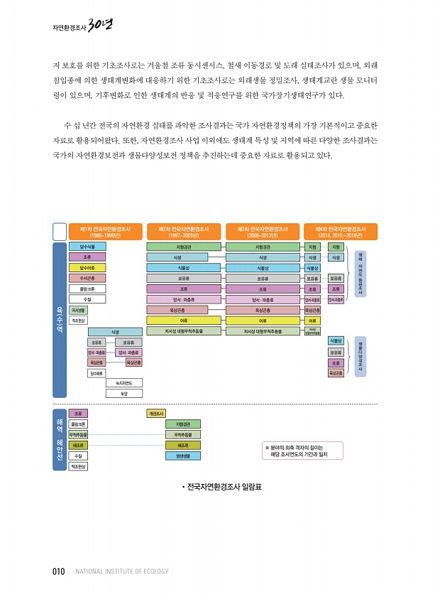 지 보호를 위한 기초조사로는 겨울철 조류 동시센서스, 철새 이동경로 및 도래 실태조사가 있으며, 외래 침입종에 의한 생태계변화에 대응하기 위한 기초조사로는 외래생물 정밀조사, 생태계교란 생물 모니터 링이 있으며, 기후변화로 인한 생태계의 반응 및 적응연구를 위한 국가장기생태연구가 있다. 수 십 년간 전국의 자연환경 실태를 파악한 조사결과는 국가 자연환경정책의 가장 기본적이고 중요한 자료로 활용되어왔다. 또한, 자연환경조사 사업 이외에도 생태계 특성 및 지역에 따른 다양한 조사결과는 국가의 자연환경보전과 생물다양성보전 정책을 추진하는데 중요한 자료로 활용되고 있다. 010 NATIONAL INSTITUTE OF ECOLOGY 자연환경조사30년 ?전국자연환경조사 일람표 적조현상 해역 · 해안선 개관조사 ※ 분야...