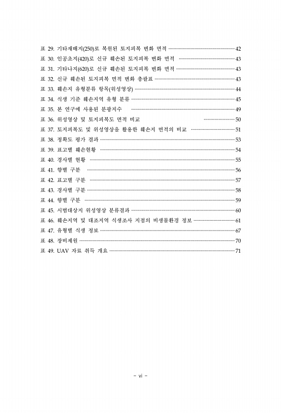 vi 표 29. 기타재배지 250 로 복원된 토지피복 변화 면적 ···················································42 표 30. 인공초지 420 로 신규 훼손된 토지피복 변화 면적 ···········································43 표 31. 기타나지 620 로 신규 훼손된 토지피복 변화 면적 ·············································43 표 32. 신규 훼손된 토지피복 면적 변화 총괄표 ·····························································43 표 33. 훼손지 유형분류 항목 위성영상 ·······························...