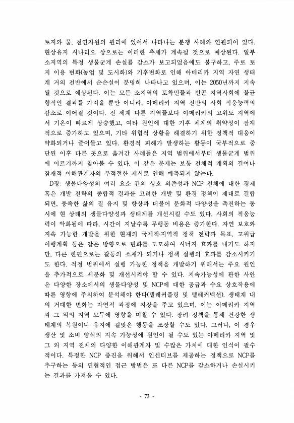 토지와 물, 천연자원의 관리에 있어서 나타나는 분쟁 사례와 연관되어 있다. 현상유지 시나리오 상으로는 이러한 추세가 계속될 것으로 예상된다. 일부 소지역의 특정 생물군계 손실률 감소가 보고되었음에도 불구하고, 주로 토 지 이용 변화 농업 및 도시화 와 기후변화로 인해 아메리카 지역 자연 생태 계 거의 전반에서 순손실이 분명히 나타나고 있으며, 이는 2050년까지 지속 될 것으로 예상된다. 이는 모든 소지역의 토착민들과 빈곤 지역사회에 불균 형적인 결과를 가져올 뿐만 아니라, 아메리카 지역 전반의 사회 적응능력의 감소로 이어질 것이다. 전 세계 다른 지역들보다 아메리카의 고위도 지역에 서 기온이 빠르게 상승했고, 여타 원인에 대한 기후 체계의 취약성이 잠재 적으로 증가하고 있으며, 기타 위협적 상황을 해결하기...