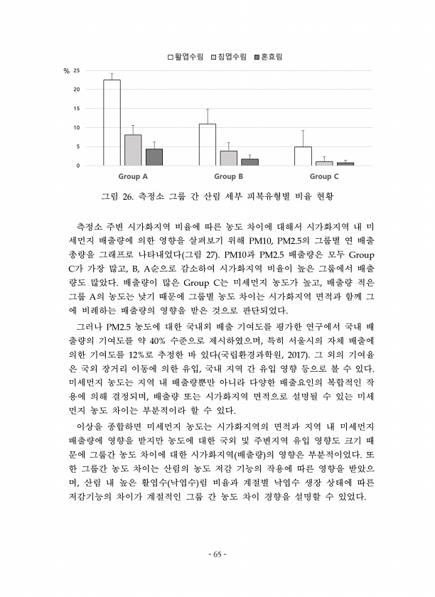 65 그림 측정소 그룹 간 산림 세부 피복유형별 비율 현황 측정소 주변 시가화지역 비율에 따른 농도 차이에 대해서 시가화지역 내 미 세먼지 배출량에 의한 영향을 살펴보기 위해 의 그룹별 연 배출 총량을 그래프로 나타내었다 그림 과 배출량은 모두 가 가장 많고 순으로 감소하여 시가화지역 비율이 높은 그룹에서 배출 량도 많았다 배출량이 많은 는 미세먼지 농도가 높고 배출량 적은 그룹 의 농도는 낮기 때문에 그룹별 농도 차이는 시가화지역 면적과 함께 그 에 비례하는 배출량의 영향을 받은 것으로 판단되었다 그러나 농도에 대한 국내외 배출 기여도를 평가한 연구에서 국내 배 출량의 기여도를 약 수준으로 제시하였으며 특히 서울시의 자체 배출에 의한 기여도를 로 추정한 바 있다 국립환경과학원 그 외의 기여율 은 국외 장거...