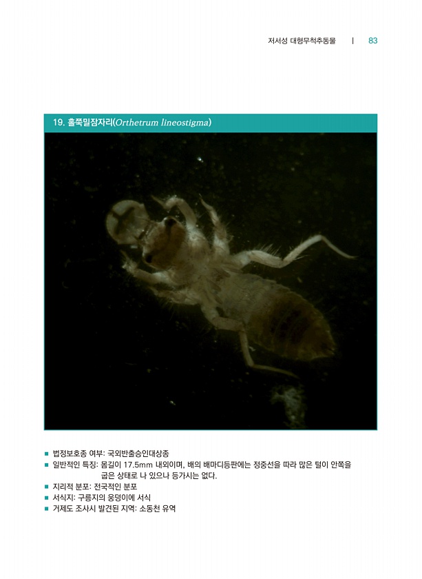 저서성 대형무척추동물 ┃ 83 19. 홀쭉밀잠자리 Orthetrum lineostigma ■ 법정보호종 여부국외반출승인대상종 ■ 일반적인 특징몸길이 17.5mm 내외이며, 배의 배마디등판에는 정중선을 따라 많은 털이 안쪽을 굽은 상태로 나 있으나 등가시는 없다. ■ 지리적 분포전국적인 분포 ■ 서식지구릉지의 웅덩이에 서식 ■ 거제도 조사시 발견된 지역소동천유역