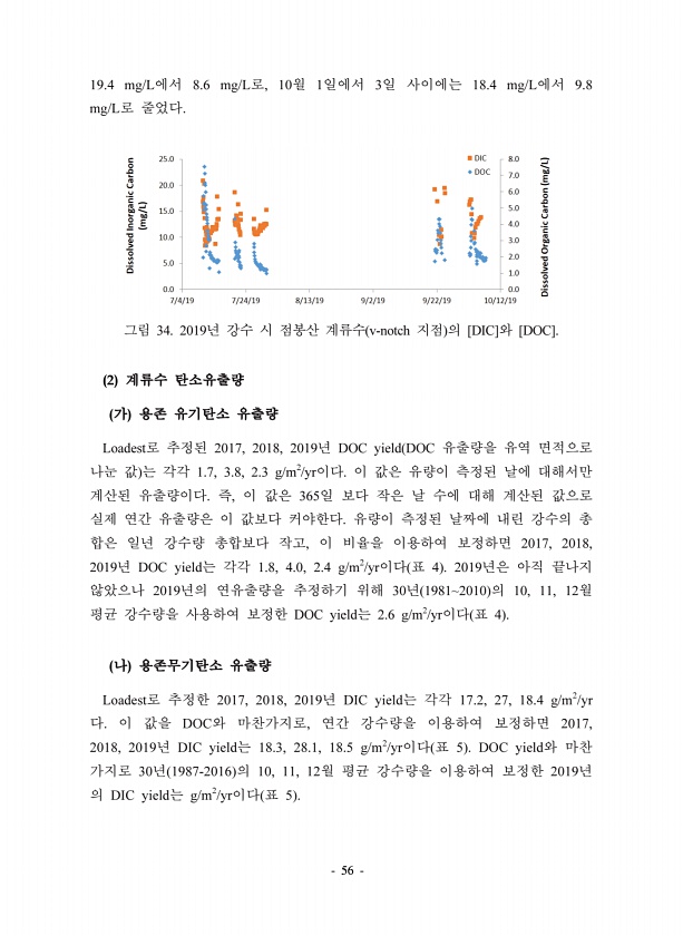 56 19.4 mg/L 8.6 mg/L , 10 1 3 18.4 mg/L 9.8 mg/L 34. 2019 v-notch [DIC] [DOC]. 2 Loadest 2017, 2018, 2019 DOC yield DOC 1.7, 3.8, 2.3 g/m2/yr , 365 , 2017, 2018, 2019 DOC yield 1.8, 4.0, 2.4 g/m2/yr 4 2019 2019 30 19812010 10, 11, 12 DOC yield 2.6 g/m2/yr 4 Loadest 2017, 2018, 2019 DIC yield 17.2, 27, 18.4 g/m2/yr DOC , 2017, 2018, 2019 DIC yield 18.3, 28.1, 18.5 g/m2/yr 5 DOC yield 30 1987-2016 ...