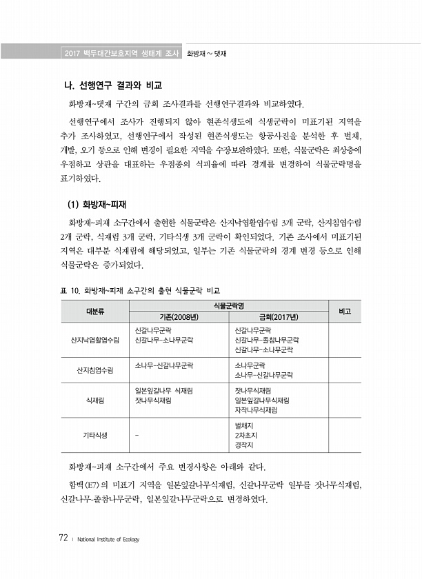 2017 백두대간보호지역 생태계 조사 화방재 댓재 72 ? National Institute of Ecology 나. 선행연구 결과와 비교 화방재댓재 구간의 금회 조사결과를 선행연구결과와 비교하였다. 선행연구에서 조사가 진행되지 않아 현존식생도에 식생군락이 미표기된 지역을 추가 조사하였고, 선행연구에서 작성된 현존식생도는 항공사진을 분석한 후 벌채, 개발, 오기 등으로 인해 변경이 필요한 지역을 수정?보완하였다. 또한, 식물군락은 최상층에 우점하고 상관을 대표하는 우점종의 식피율에 따라 경계를 변경하여 식물군락명을 표기하였다. 1 화방재피재 화방재피재 소구간에서 출현한 식물군락은 산지낙엽활엽수림 3개 군락, 산지침엽수림 2개 군락, 식재림 3개 군락, 기타식생 3개 군락이 확인되었다. 기존 조사에서 미표기된...
