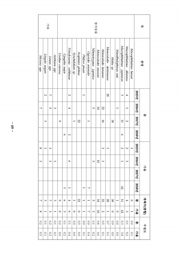 목 종명 봄 가을 개체수 종합 우점도 2015년 2016년 2017년 2018년 2015년 2016년 2017년 2018년 봄 가을 봄 가을 절지동물 Macrophthalmus banzai 1 0 1 0.0 0.1 Macrophthalmus dilatatus 4 1 2 2 3 4 3 0.1 0.2 Macrophthalmus japonicus 3 11 6 2 1 62 11 62 0.3 3.8 Mandibulophoxus mai 1 1 0 0.0 0.0 Melita sp. 38 38 0 0.9 0.0 Monoculodes dentimanus 28 1 28 1 0.7 0.1 Monoculodes koreanus 22 16 2 1 22 2 0.5 0.1 Monoculodes muwoni 34 10 34 10 0.8...