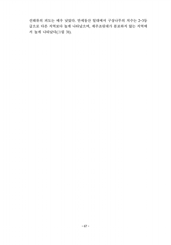 67 선태류의 피도는 매우 낮았다. 만세동산 일대에서 구상나무의 치수는 23등 급으로 다른 지역보다 높게 나타났으며, 제주조릿대가 분포하지 않는 지역에 서 높게 나타났다 그림 31 67