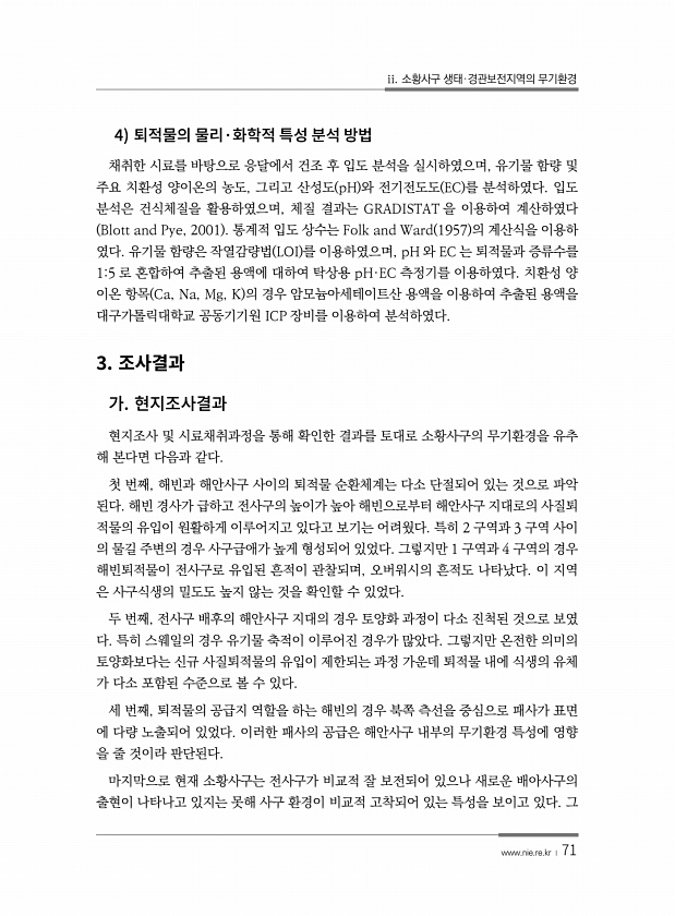 ii. 소황사구 생태·경관보전지역의 무기환경 www.nie.re.kr ? 71 4 · 채취한 시료를 바탕으로 응달에서 건조 후 입도 분석을 실시하였으며, 유기물 함량 및 주요 치환성 양이온의 농도, 그리고 산성도 pH 와 전기전도도 EC 를 분석하였다. 입도 분석은 건식체질을 활용하였으며, 체질 결과는 GRADISTAT 을 이용하여 계산하였다 Blott and Pye, 2001 통계적 입도 상수는 Folk and Ward 1957 의 계산식을 이용하 였다. 유기물 함량은 작열감량법 LOI 를 이용하였으며, pH 와 EC 는 퇴적물과 증류수를 15 로 혼합하여 추출된 용액에 대하여 탁상용 pH·EC 측정기를 이용하였다. 치환성 양 이온 항목 Ca, Na, Mg, K 의 경우 암모늄아세테이트산 용액을 이용하여 ...