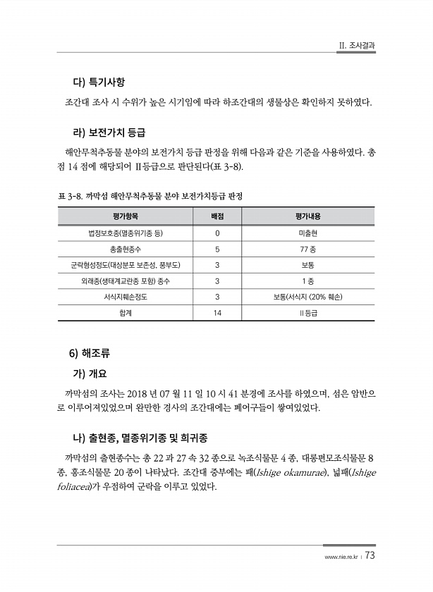 II. 조사결과 www.nie.re.kr ? 73 조간대 조사 시 수위가 높은 시기임에 따라 하조간대의 생물상은 확인하지 못하였다. 해안무척추동물 분야의 보전가치 등급 판정을 위해 다음과 같은 기준을 사용하였다. 총 점 14 점에 해당되어 Ⅱ등급으로 판단된다 표 3-8 평가항목 배점 평가내용 법정보호종 멸종위기종 등 0 미출현 총출현종수 5 77 종 군락형성정도 대상분포 보존성, 풍부도 3 보통 외래종 생태계교란종 포함 종수 3 1 종 서식지훼손정도 3 보통 서식지 20% 훼손 합계 14 Ⅱ등급 표 3-8. 까막섬 해안무척추동물 분야 보전가치등급 판정 6 까막섬의 조사는 2018 년 07 월 11 일 10 시 41 분경에 조사를 하였으며, 섬은 암반으 로 이루어져있었으며 완만한 경사의 조간대에는 폐어구들이 ...