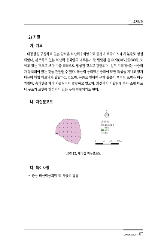II. 조사결과 www.nie.re.kr ? 67 2 대정섬을 구성하고 있는 암석은 화산력응회암으로 중생대 백악기 시대에 분출로 형성 되었다. 분포하고 있는 화산력 응회암의 대부분이 잘 발달된 층리 N80W/25NW 를 보 이고 있는 것으로 보아 수중 퇴적으로 형성된 것으로 판단되며, 일부 지역에서는 사층리 가 분포되어 있는 것을 관찰할 수 있다. 화산력 응회암은 풍화에 약한 특성을 지니고 있기 때문에 대형 타포니가 발달하고 있으며, 풍화로 인하여 구형 돌출이 형성된 표면은 매우 거칠다. 층리면을 따라 차별침식이 발달하고 있으며, 화산력이 이탈됨에 따라 소형 타포 니 구조가 표면에 형성되어 있는 곳이 관찰되기도 한다. 그림 12. 대정섬 지질분포도 층상 화산력응회암 및 사층리발달