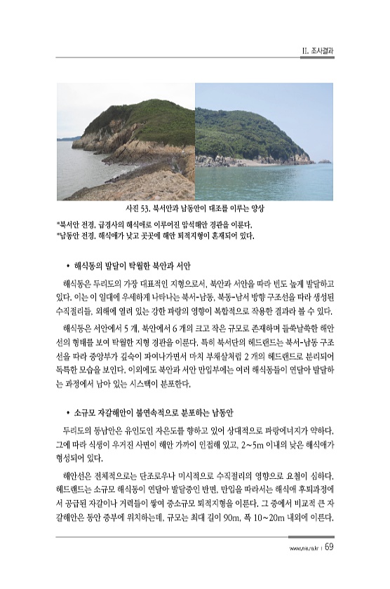 II. 조사결과 www.nie.re.kr ? 69 사진 53. 북서안과 남동안이 대조를 이루는 양상 *북서안 전경. 급경사의 해식애로 이루어진 암석해안 경관을 이룬다. *남동안 전경. 해식애가 낮고 곳곳에 해안 퇴적지형이 혼재되어 있다. ? 해식동의 발달이 탁월한 북안과 서안 해식동은 두리도의 가장 대표적인 지형으로서, 북안과 서안을 따라 빈도 높게 발달하고 있다. 이는 이 일대에 우세하게 나타나는 북서-남동, 북동-남서 방향 구조선을 따라 생성된 수직절리들, 외해에 열려 있는 강한 파랑의 영향이 복합적으로 작용한 결과라 볼 수 있다. 해식동은 서안에서 5 개, 북안에서 6 개의 크고 작은 규모로 존재하며 들쑥날쑥한 해안 선의 형태를 보여 탁월한 지형 경관을 이룬다. 특히 북서단의 헤드랜드는 북서-남동 구조...