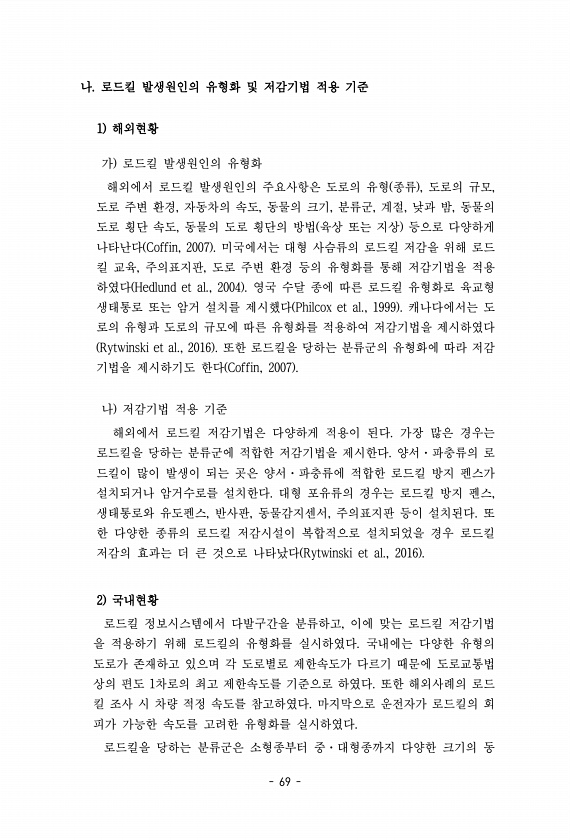 69 나. 로드킬 발생원인의 유형화 및 저감기법 적용 기준 1 해외현황 가 로드킬 발생원인의 유형화 해외에서 로드킬 발생원인의 주요사항은 도로의 유형 종류 , 도로의 규모, 도로 주변 환경, 자동차의 속도, 동물의 크기, 분류군, 계절, 낮과 밤, 동물의 도로 횡단 속도, 동물의 도로 횡단의 방법 육상 또는 지상 등으로 다양하게 나타난다 Coffin, 2007 미국에서는 대형 사슴류의 로드킬 저감을 위해 로드 킬 교육, 주의표지판, 도로 주변 환경 등의 유형화를 통해 저감기법을 적용 하였다 Hedlund et al., 2004 영국 수달 종에 따른 로드킬 유형화로 육교형 생태통로 또는 암거 설치를 제시했다 Philcox et al., 1999 캐나다에서는 도 로의 유형과 도로의 규모에 따른 유형화를 적용하여...