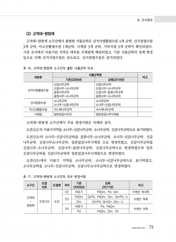 Ⅱ. 조사결과 www.nie.re.kr ? 73 2 고적대원방재 고적대원방재 소구간에서 출현한 식물군락은 산지낙엽활엽수림 4개 군락, 산지침엽수림 3개 군락, 아고산활엽수림 1개군락, 식재림 3개 군락, 기타식생 3개 군락이 확인되었다. 기존 조사에서 미표기된 지역은 대부분 식재림에 해당되었고, 기존 식물군락의 경계 변경 등으로 인해 산지낙엽수림은 감소되고, 산지침엽수림은 증가되었다. 표 16. 고적대원방재 소구간의 출현 식물군락 비교 대분류 식물군락명 비고 기존 2009년 금회 2018년 산지낙엽활엽수림 신갈나무군락 신갈나무-소나무군락 굴참나무군락 굴참나무-소나무군락 신갈나무군락 신갈나무-소나무군락 신갈나무-굴참나무군락 굴참나무-소나무군락 산지침엽수림 소나무군락 소나무-신갈나무군락 소나무군락 소나무-신갈나...