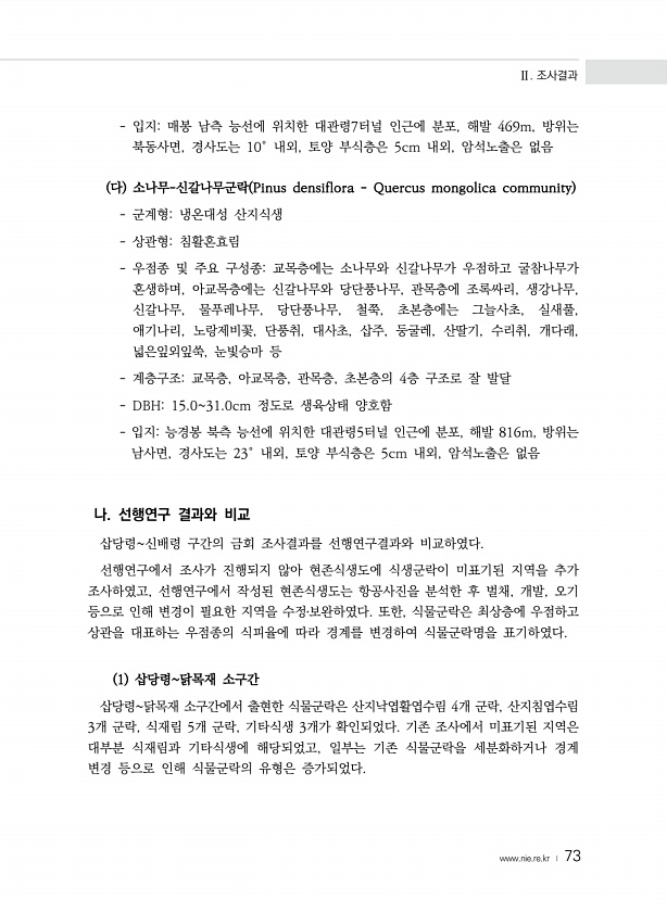 Ⅱ. 조사결과 www.nie.re.kr ? 73 입지매봉 남측 능선에 위치한 대관령7터널 인근에 분포, 해발 469m, 방위는 북동사면, 경사도는 10° 내외, 토양 부식층은 5cm 내외, 암석노출은 없음 다 소나무-신갈나무군락 Pinus densiflora Quercus mongolica community 군계형냉온대성 산지식생 상관형침활혼효림 우점종 및 주요 구성종교목층에는 소나무와 신갈나무가 우점하고 굴참나무가 혼생하며, 아교목층에는 신갈나무와 당단풍나무, 관목층에 조록싸리, 생강나무, 신갈나무, 물푸레나무, 당단풍나무, 철쭉, 초본층에는 그늘사초, 실새풀, 애기나리, 노랑제비꽃, 단풍취, 대사초, 삽주, 둥굴레, 산딸기, 수리취, 개다래, 넓은잎외잎쑥, 눈빛승마 등 계층구조교목층, 아교목층, 관목층,...